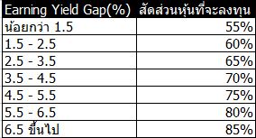 ตัวเลขที่ผมใช้เป็นกลยุทธ์ของพอร์ตคือ 70:30 ครับ โดยปกติจะเริ่มต้นที่หุ้น 70% เพื่อพยายามจะให้พอร์ตมีผลตอบแทนที่คาดหวังประมาณ 9% ต่อปี (ให้ชนะเงินเฟ้อ 3 เท่า) และเราจะมีวิธีปรับปรุงครับ เราจะไม่ลงทุนทื่อ ๆ ที่ หุ้น70% โดยเราจะมี range ช่องว่างที่หุ้นสามารถขยับลงทุนได้ตั้งแต่ 55-85% เลยทีเดียว (บวกลบ 15%) โดยใช้การหา Earning Yield Gap เข้ามาเสริมครับ ถ้าตัวเลขนี้สูงเราจะขยับสัดส่วนหุ้นให้สูงขึ้นได้เกิน 70%ครับ วิธีคิดตัวเลขนี้คือ เอา 100 ตั้งแล้วหารด้วย PEตลาดหุ้นไทย(SET) เสร็จแล้วลบด้วยผลตอบแทนพันธบัตรรัฐบาลไทย 10 ปีครับ โดยตัวเลขเฉลี่ย Earning Yield Gap (EYG) ตรงส่วนนี้จะอยู่ที่ 4% ครับ ดังนั้น ระบบลงทุนของเราจะเป็นแบบนี้ครับ