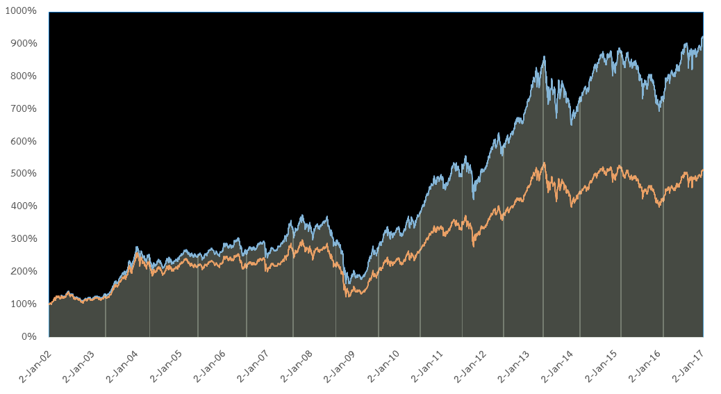 ซึ่งดัชนีที่ทำหน้าที่แสดงผลตอบแทนทบต้นและผลตอบแทนโดยรวมของตลาดหุ้นจริงๆ ก็คือ SET Total Return Index (SET TR หรือ SET TRI) ซึ่งคำนวณเสมือนมีการถือหุ้นทั้งตลาดแล้วเวลาได้ปันผลก็นำมาลงทุนทบต้นกลับทันทีดังที่อธิบายข้างบนครับ ถามว่ามันแตกต่างกันมากหรือไม่ ลองดูภาพข้างล่างนี้ครับ เนื่องจากตลาดหลักทรัพย์ได้เริ่มคำนวณ SET TR ในวันที่ 2 มกราคม 2545 (2002) และเลขฐานคือ 1,000 จุด ในขณะเดียวกันวันดังกล่าวดัชนีตลาดหุ้น SET PR หรือ SET Index อยู่ที่ 305.19 จุด ผมได้เทียบผลตอบแทนเป็นเปอร์เซ็นต์ โดยให้วันดังกล่าวเริ่มต้นที่ 100% ข้างล่างคือภาพเปรียบเทียบผลตอบแทนของ SET TR กับ SET Index ครับ (SET TR คือเส้นสีฟ้า)